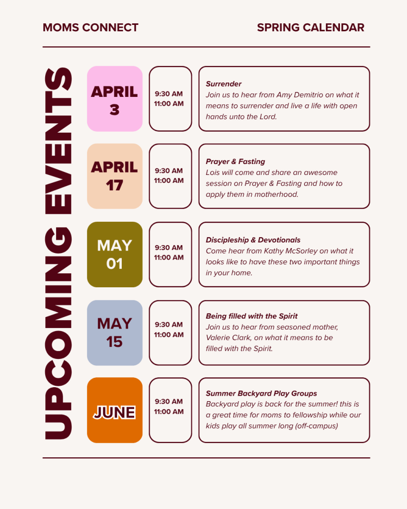 This will be a welcoming time of fellowship and connection for moms in all seasons of life, with a focus on God’s Word and spiritual growth. This is not a formal study with homework, but we do use books and/or bible study videos as a framework for our gathering. Each session can stand alone, so it’s okay if you miss a session or come after the start date.
